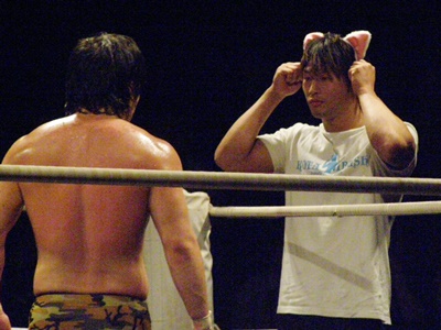 飯伏がエプロンに立つと佐藤は「言葉はいらねえ!」と猫ミミを差し出す。