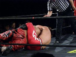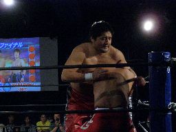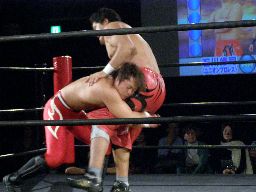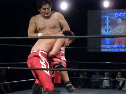 石川抱え上げてパワーボム(右写真)、HARASHIMAダウン。ロストポイント2。カウント6で立つ。