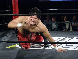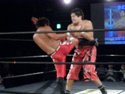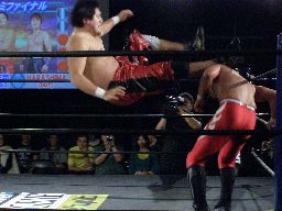 立ち上がったHARASHIMAに石川32文ドロップキック(右写真)、HARASHIMA場外でダウン。ロストポイント3。