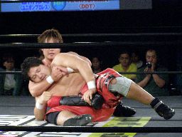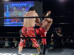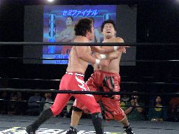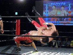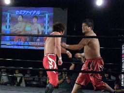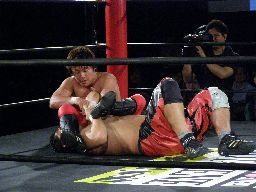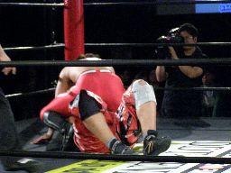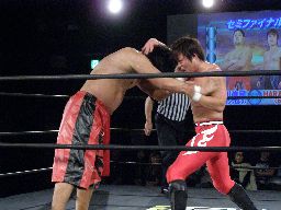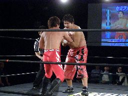 HARASHIMA十字(右写真)、石川ブロック。HARASHIMA三角絞めに、石川ブレーク。両者立つ。