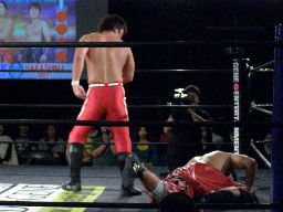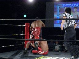 HARASHIMAハイキック、石川ダウン(左写真)。ロストポイント3。石川はカウント9で立つ。