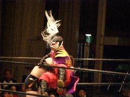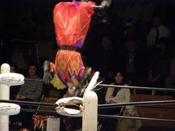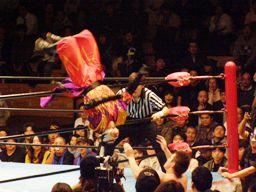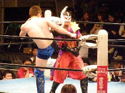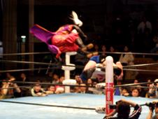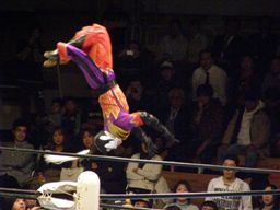 義経ハイキック、エプロンに出てスワンダイブウラカン・ラナ(右写真)、ハヤト途中で止めて顔面にローキック。