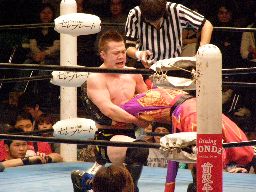 そのまま雪崩式DDTのように落としてKIDに(右写真)、義経ロープ。