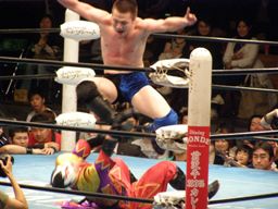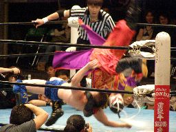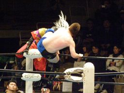 再び場外に落ちたハヤトに義経はサスケスペシャルU(右写真)、義経リングサイドでフットスタンプ。