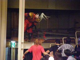 義経北側客席横の資材置き場に上る。ハヤトも上りそこからバックドロップ狙うが義経突き落とし(左写真)ダイビングフットスタンプ。15分経過。