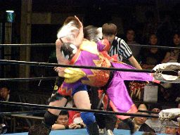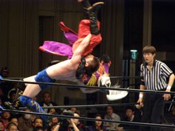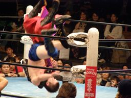 義経バックスピンキック、ハヤトをコーナーに上げてトップロープからの一回転ベリートゥベリー(左写真)、カウント2。25分経過。