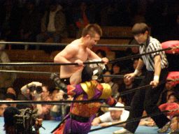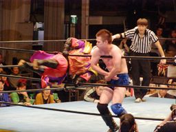 義経ネックロック、ハヤト切り返し首投げからサッカーボールキック。義経もサッカーボールキックやり返す。ハヤトもう一度首投げ、義経下からキック。義経飛びついて2回転コルバタ、ハヤト場外転落。義経はトペのフェイント、ハヤトがエプロンに上がるとボディに619(左写真)。