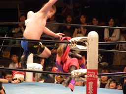ハヤトは義経をコーナーに上げると雪崩式リストクラッチバックドロップ(左写真)、カウント2。