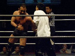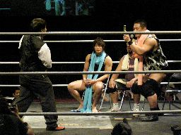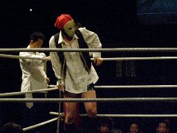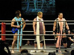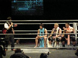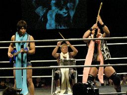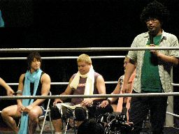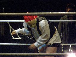 そしてセミファイナル、村田アナの要求どおりタイトルマッチが組まれた。新設のIMGP6人タッグ選手権。さっきの海賊男(左写真)はパイレーツ・オブ・カリビアン・コムというらしい。この名前でウケた人はまず間違いなくスケベです。