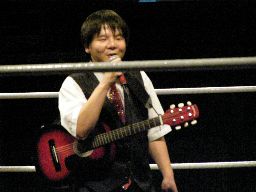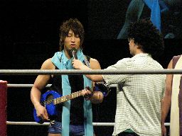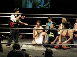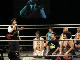 飯伏コーナーに上り(右写真)、ギター抱えたままバック宙。