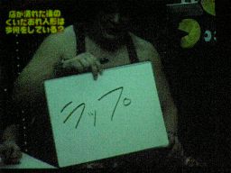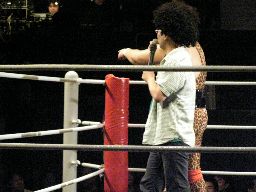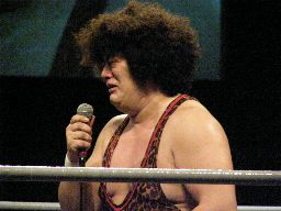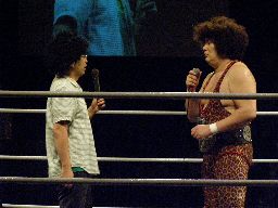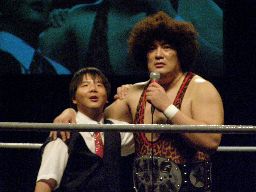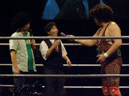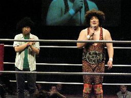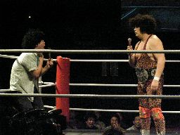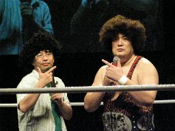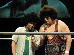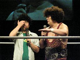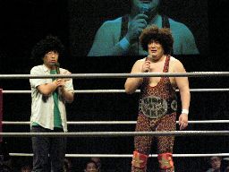 タッグマッチなので亜門さんが一緒に行くかと思ったら「俺アドリブに弱いから」と辞退。インタケが本部席から「得意です!」と立候補(右写真)。吉本vsSMAか。