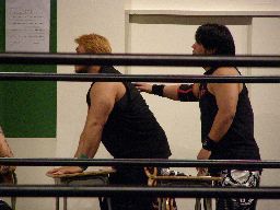 3人でストンピング、タイツを脱がせようとする(左写真)。ここで暗転、スローモーションに。しかし曲は中島みゆきの「世情」。
