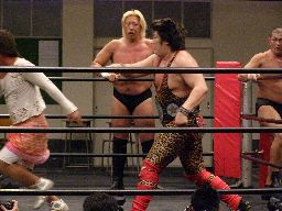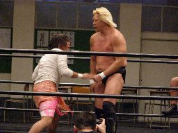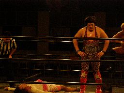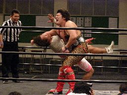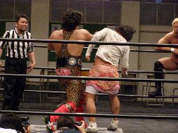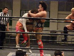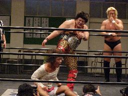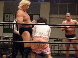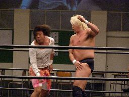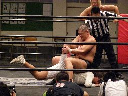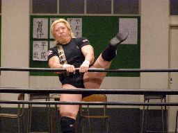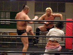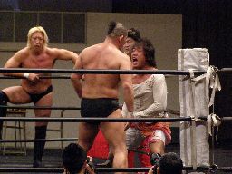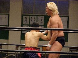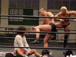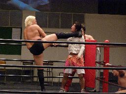 ハイキック(右写真)、場外に出す。場外で鈴木キック。大家らが向かっていくが坂井が立ちはだかり「手を出すな!」高山リングに戻す。5分経過。