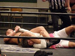 726立ち上がる、鈴木ヒザ蹴りで倒し逆片エビ(右写真)、726ロープ。坂井「決めさせてください。」とタッチ要求、鈴木は坂井にタッチ。