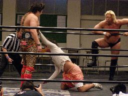 コーナーに詰めて両足で踏む(右写真)。自軍コーナーに投げつけて串刺しビッグブーツ、鈴木にタッチ。