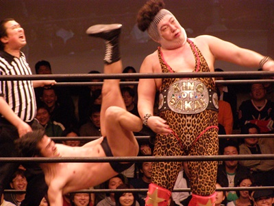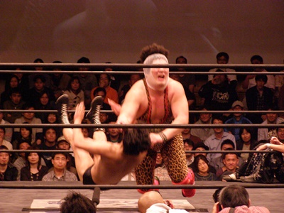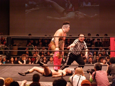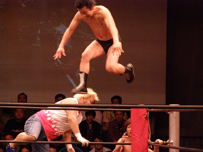 ハチミツがセットして小猪木がダイビングニードロップ(右写真)。さらに正座式ニードロップ2連発、カウント2。