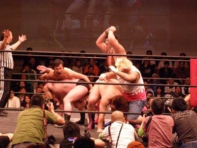 カットに入ったディーノにハチミツは肥満児固め、坂井がカット(左写真)。