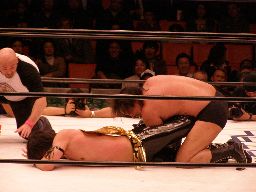 シャークがタイガードライバー(右写真)。この技は必須なのだなあ。カウントは1。