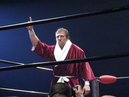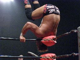 ダニエルソンコーナーに振る、マッギネスコーナーで倒立(右写真)。ダニエルソンドロップキックで落とす。