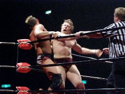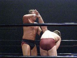 ロックアップでスタート、ダニエルソンがコーナーに押し込む、ブレーク。手四つからマッギネス腕をひねってヒジに力を込める(左写真)。ホイップからアームロック、ダニエルソンロープ。