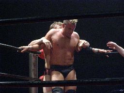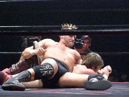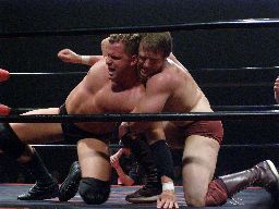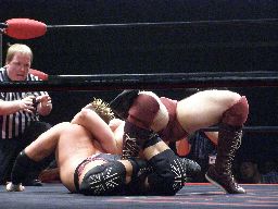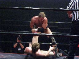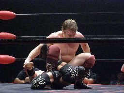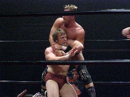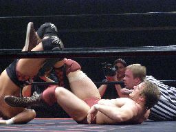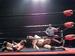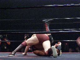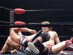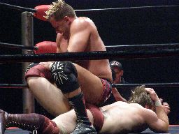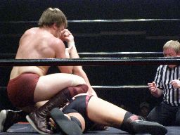 マッギネスエルボースマッシュ、ダニエルソンは足をすくってまたヒザを固める(右写真)、そこからインディアンデスロックに。ダニエルソン上からエルボー、カバー、カウント1。