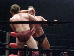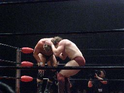 ダニエルソンコーナーに詰めてエルボースマッシュ、マッギネスも打ち返す(左写真)。マッギネスブレーンバスター狙う、ダニエルソンブロックしてノーザンライトスープレックス狙う、マッギネスもブロック。