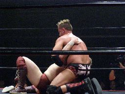 マッギネスエルボースマッシュ(右写真)、首投げからサッカーボールキック、カウント2。
