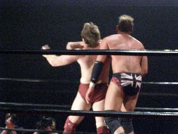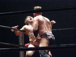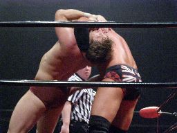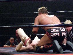 ダニエルソントペ狙う、マッギネスはクロスチョップでブロック(右写真)、エプロンから場外へのタワー・オブ・ロンドンに。