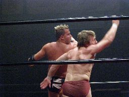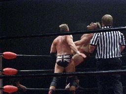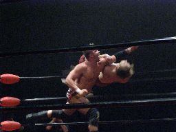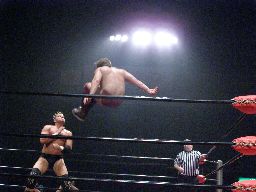 マッギネスヒザ蹴り、トップロープに乗せてジョーブレイカーラリアット(右写真)、カウント2。