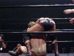 マッギネス立ち上がらせて(左写真)リバースブレーンバスターの形でコーナーに乗せる。