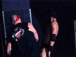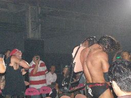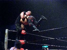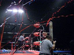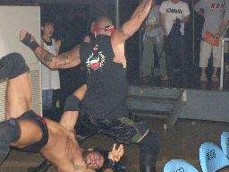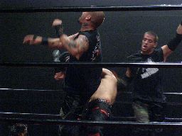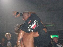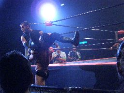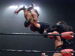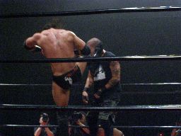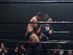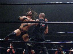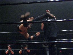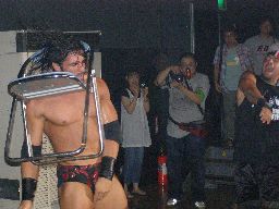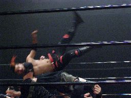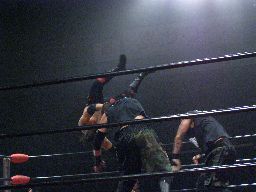 ブラックがジェイを客席にパワーボムで投げ込む(右写真)。