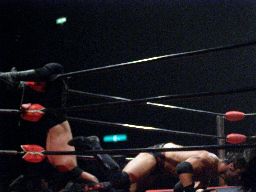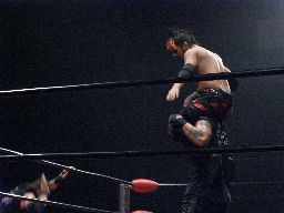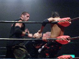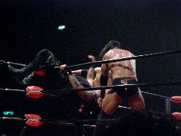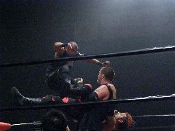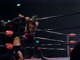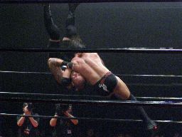 ブラックがジェイをコーナーに逆さ吊り(右写真)、