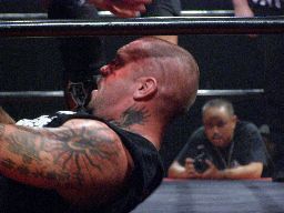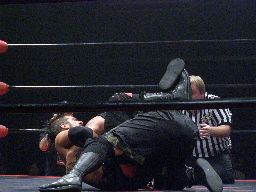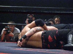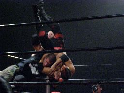 ブラックがパワーボムの体勢に担ぎ上げてジェイコブスがスーパー不知火(左写真)、カウント2。