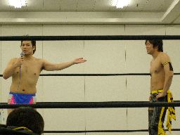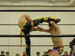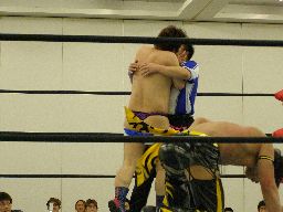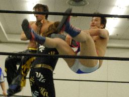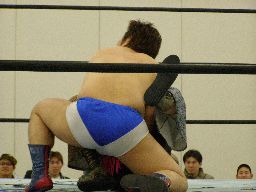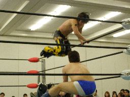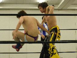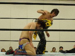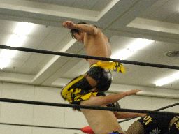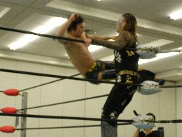 KUDOトップロープ越しのダブルニードロップ(右写真)。