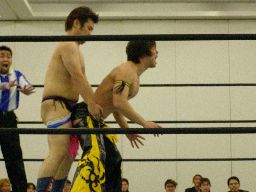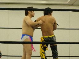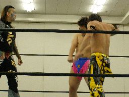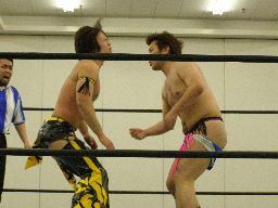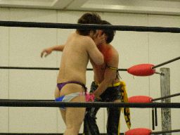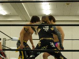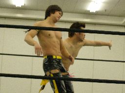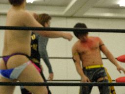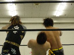 ポイズンが先制攻撃を掛けて試合開始。ポイズンとKUDOダブルのエルボー(右写真)、ディーノ場外に。ポイズンエルボー、KUDOドロップキック。