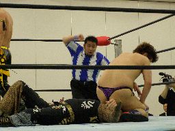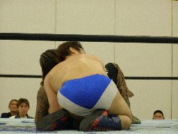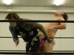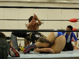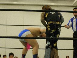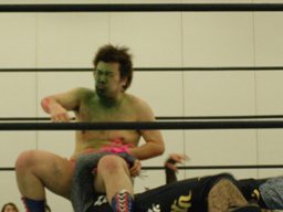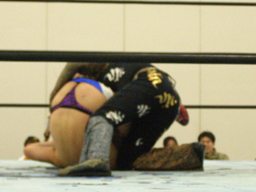 KUDOがキック、ディーノポイズンの顔面に座り込む(右写真)、カウント2。