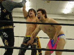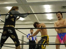 いつの間にかポイズンの逆水平とディーノのタッチを一人で受ける羽目に(左写真)。KUDO場外エスケープ。