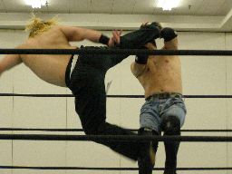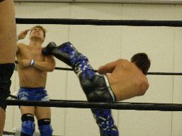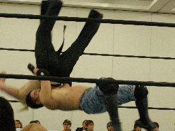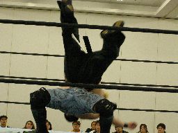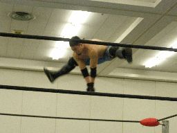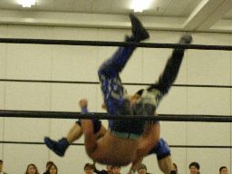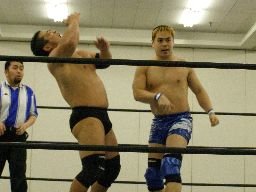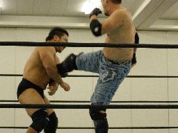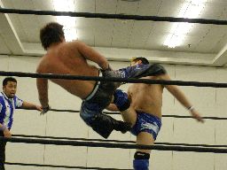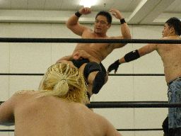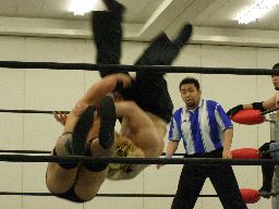 TAKAとHARASHIMAが入る。HARASHIMAジャンピングハイキック(左写真)から山折り。