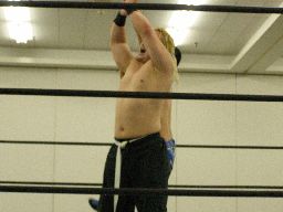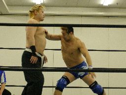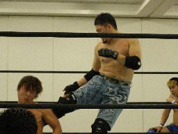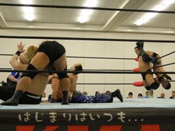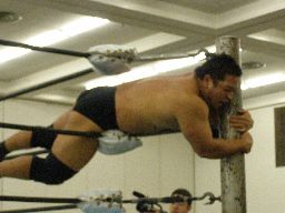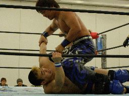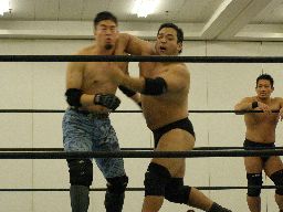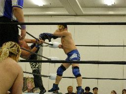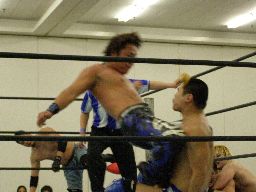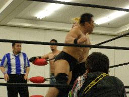 TAKAエルボー3連打、逆水平(右写真)、サミング。関本コーナーに連れ帰ってHARASHIMAにタッチ。20分経過。