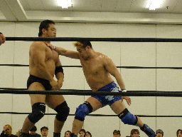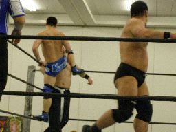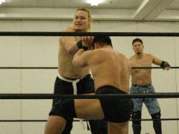 手四つからの力比べは真霜が優勢(右写真)、しかし高木次第に盛り返し、真霜の手の甲をマットに着けると足で踏んでTAKAにタッチ。5分経過。