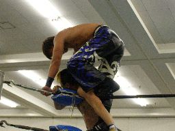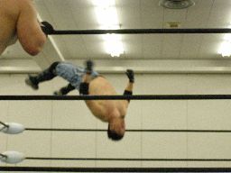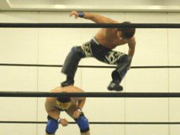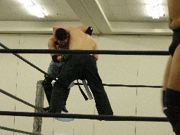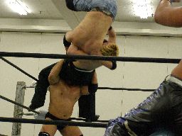 伊東コーナーに上る、真霜も上ってハイキック。真霜が雪崩式ブレーンバスター狙う、伊東ブロック(右写真)