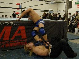 伊東と真霜立ち上がってエルボーの打ち合い、伊東真霜にバックドロップ(左写真)。