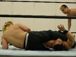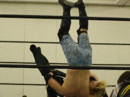 HARASHIMAコーナーに乗ってヒザで圧迫(右写真)、エルボースタッブ、ワキ固め、レッグドロップからカバー、カウント2。10分経過。