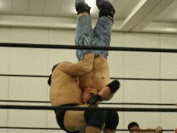 3人で踏みつけ、高木HARASHIMAをロープに振ってエルボー。高木STFから裏STFに(右写真)、HARASHIMAロープ。高木は伊東にタッチ。15分経過。