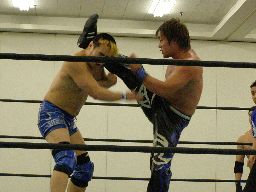 エルボーの打ち合いから伊東ミドルキック(左写真)、ロープに飛ぶ、関本カウンターのラリアット、カウント2。
