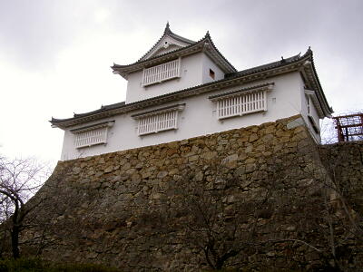 前回同様中腹の鞴峠駐車場までタクシーで。なんかやたらニホンザルがいる。管理者のおっさんの後は着いて行くがこっちに来ることはない。松山城はニホンザル生息地ではあるのだが、これだけ出てきてるってのはやっぱり冬で餌付け以外のエサがないせいだろうか?鞴峠から城までは約1km。途中の山道には雪はなし。安心していると城域に入った辺りから突然雪が積もっていた。しかも半分凍っている。距離が短いし傾斜もないとこだから何とかなるが。天気は晴れ、城の屋根にはもうほとんど雪はなし。2回目だけどここもいい城だ。