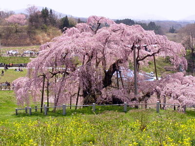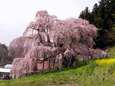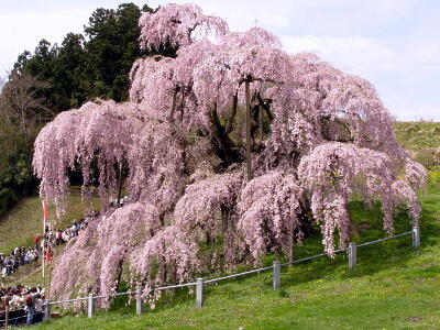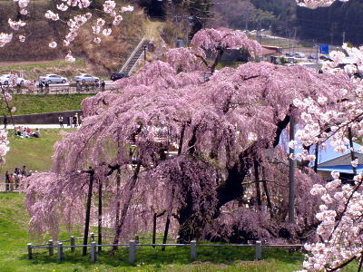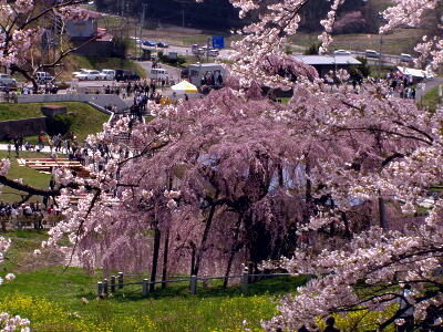 一旦丘を登って見下ろすとそこに滝桜。保護のため遠巻きに見る形。