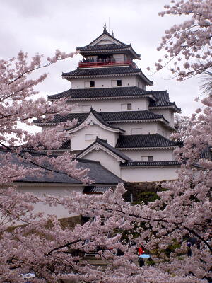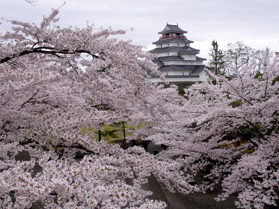 桜と天守。北出丸から出て11時39分の周遊バスで次の目的地・神指城の最寄の七日町駅へ。神指城は上杉景勝が鶴ヶ城からの移転を考えて作ろうとしたが、完成前に関ヶ原の戦いが終わり上杉家が米沢に転封になったためそのまま廃城になった城。