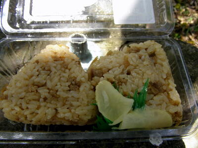 散策開始前に西鉄福岡駅で買っておいたかしわめしのおにぎりで昼食。残念ながら西鉄の駅には駅弁はないようだ。