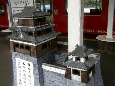 駅のホームにあった竹田城天守の想像復元模型。15時59分の九州横断特急は豪雨のため熊本より先の運転取りやめとなったが自分は熊本まで行ければいいので問題なし。